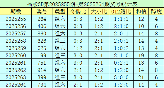 上期回顾:福彩3D第2025264期开奖号码为734,组选类型为组六,奇偶比为2:1,大小比为1:2。