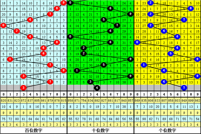 首位跨度分析:首位号码最近3期奖号为9-3-7,连续两期跨度为6、4,历史上首位号码连续两期分别开出跨度6、4的现象共出现72次,其前两次开出奖号分别为: