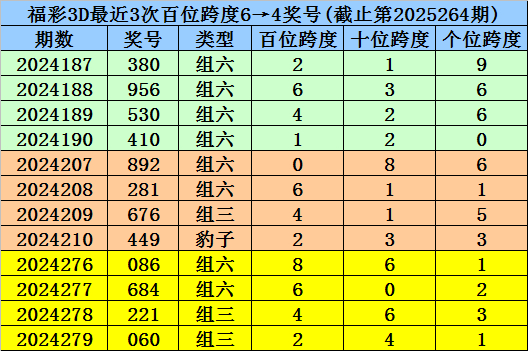 第2024276-第2024278期奖号:086、684、221,其下期奖号为:060,首位号码跨度为2;